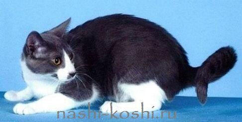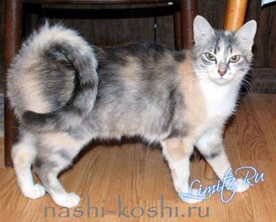 У нас на работе живёт такая кошка,прибилась с улицы.Не знаем породистая или нет,но хвост обалдел ный,как у лайки кольцом,правда гибкий.