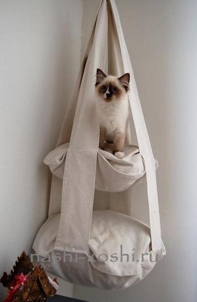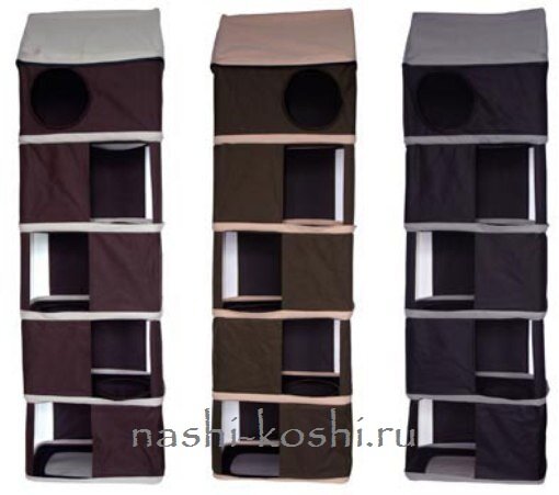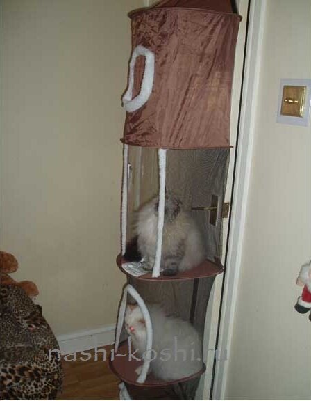 Вот такая башня для кошки изготовлена из плотной ткани, ее можно подвесить на дверь, или прикрепить к потолку. В наших магазинах, типа Икеа, можно купить подвесные полки для шкафа из ткани, а так же сетки для хранения детских игрушек. Если обтянуть стены в одном углу до потолка ковролином, и подвесить на штангу пару-тройку таких «башен», может получиться оригинальный бюджетный вариант кошачьего игрового комплекса.