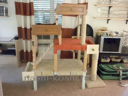 Кошачье дерево из ненужной мебели: в дело пошли столики, табуреты, выдвижные ящики. Оригинально и с выдумкой. Главное, хорошо закрепить конструкцию.