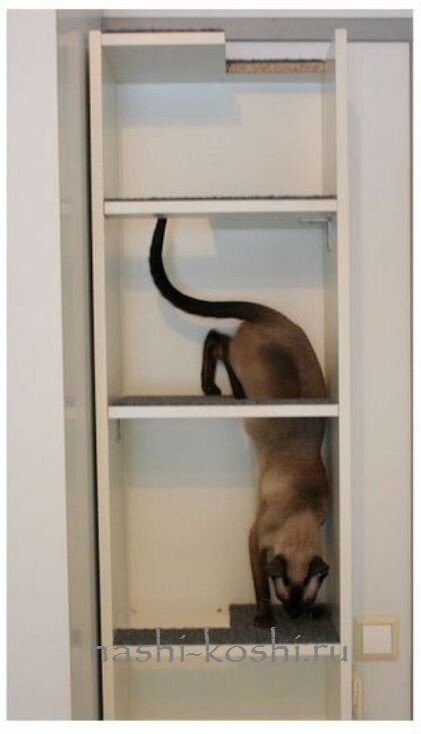 Еще один вариант, то ли из стремянки, то ли из подставки для цветов. Стойки обматываются веревкой и служат заодно когтеточкой. На самом деле, это специальное кошачье дерево от какого-то японского дизайнера.
