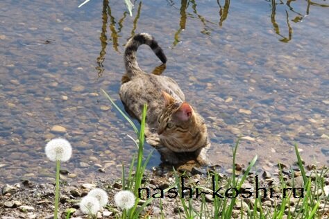 «Это кот моей дочери и зятя. Как все бенгалы, Леонардо любит купаться, а еще он неравнодушен к змеям. Вообще у них живут два бенгала: кот и кошка. Оба были куплены у заводчиков кошек. Как и все бенгалы, оба обожают воду. В речке котишка оказался по собственному желанию, в тот день было очень жарко.