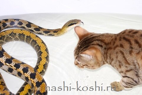 Оба любят наблюдать за змейкой в террариуме, но неожиданно вместе оказались в ванне змея и Лео. Кот — потому что любит воду и прибегает каждый раз когда хозяева идут в ванную, а змейка наверное плавала перед этим в ванне, подробностей я не помню.