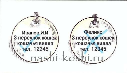 Любая кошка, находящаяся на свободном выгуле, должна иметь ошейник с медалькой, на которой написано имя владельца, адрес и номер телефона. Такой ошейник тоже может помочь найти потерявшуюся кошку. Никогда не указывайте кличку, поскольку это может помочь потенциальному вору украсть кошку.