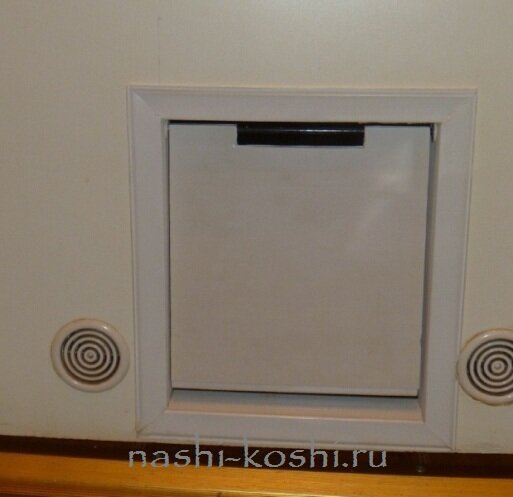 На одном из интернет-форумов встретился такой вариант: рама была декорирована пластиковым кабель-каналом, а дверца выполнена из пластиковой панели и подвешена на карниз (металлический прут) самым нехитрым способом — на манер флажка на древке. Можно соорудить пластиковую шторку на металлических кольцах и карнизе. Пары прочно зафиксированных колец будет достаточно.