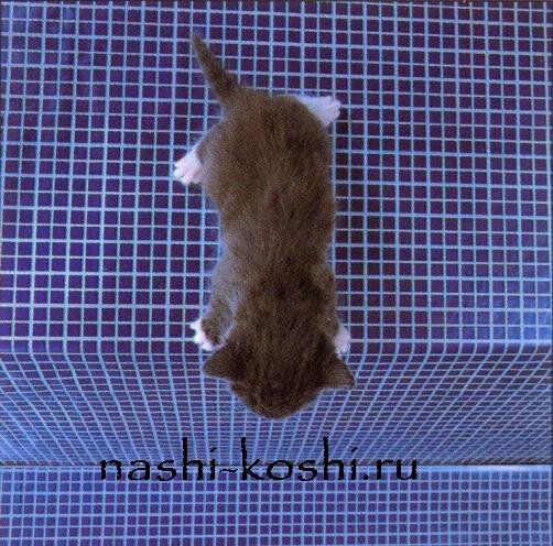 Кошки так же как и люди, поддаются обманам зрения. Этот маленький котенок застыл у мнимого края стола и робко заглядывает «вниз». На самом деле он сидит на ровном стекле, покрытый скатертью стол — нарисованный.
