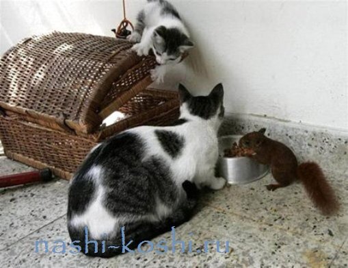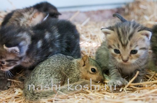 Кошки, воспитывающие крысят, бельчат и ежат, выглядят очень трогательно, однако специалисты советуют как можно скорей выпускать найденышей на волю. Ведь, воспитанные кошками белки, перестают видеть в них опасность и легко могут стать добычей других кошек. Так же, как и птенцы.