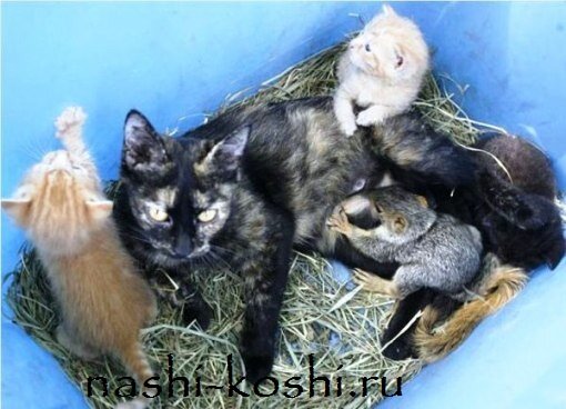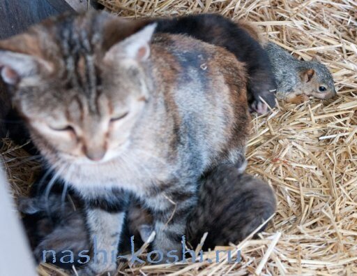 Еще одно трогательное видео о том, как мама-кошка усыновила бельчат