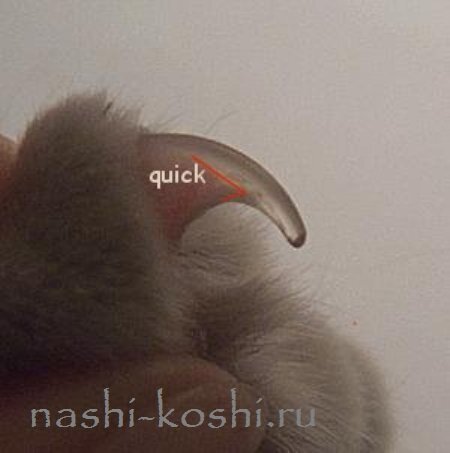 Обратите внимание, что в середине и у основания коготь розовый. Это живая часть, содержащая сосуды и нервы. Эта часть когтя ни в коем случае не должна быть задета, это может вызвать боль и кровотечение. Если вы случайно задели живую часть когтя, примените кровоостанавливающие и дезинфицирующие средства. Если ничего нет под рукой, попробуйте присыпать коготь мукой. Кровотечение должно остановиться в течение 5 минут.