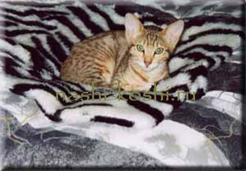 Окрас является наследием диких предков – цвета пустыни. Фон от светло-бежевого до цвета корицы, пятна – сил, шоколад или корица. У этой кошки своеобразный окрас – одновременно и тикинг (опоясывающие темные полоски на каждом волоске) и пятнистый рисунок (табби). Резкость рисунка пятен смягчена за счет тикинга. Признается пятнистый и мраморный табби. Серебристые окрасы не допускаются. Пятна расположены горизонтально или по диагонали. На шее – «обручи», брюхо светло-бежевое в пятнах, подбородок и горло светло-бежевые или белые. Кончик хвоста темный, с несколькими опоясывающими полосами.