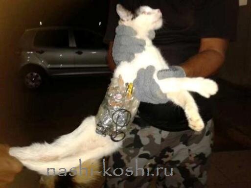Бедный котик! Кошки ведь так не любят, когда на них цепляют скотч, а эти уроды столько всякой дряни на него намотали 🙁