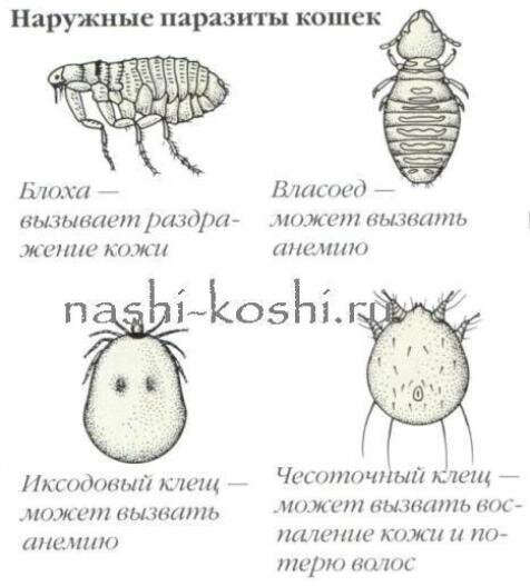 Кожные паразитыблохи, власоеды, клещи и чесоточные клещи — чаще всего появляются в жару. Блохи, вши и клещи могут повредить волосяной покров кошки. Укус одной-единственной блохи способен вызвать зуд и раздражение кожи, То есть аллергическую реакцию на ее слюну, попадающую под кожу в момент укуса.