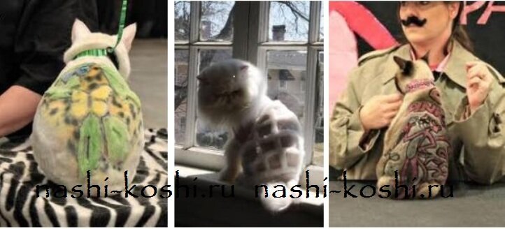 Несколько лет назад подобные фото наделали много шума в интернете и вызвали весьма неоднозначную реакцию публики, в том числе и протесты «зеленых». С одной стороны, прошла информация о том, что кошачий бодиарт исключительно популярен на Западе, среди состоятельных людей, которые выкладывают за «роспись по кошке» кругленькие суммы. С другой стороны, будто бы группа художников призналась, что они раскрасили не живых кошек, а их фотографии в фотошопе.