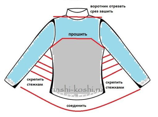 Приступаем к работе. Если у нашего свитера есть воротник, его нужно отрезать, срез подогнуть и прошить. Это можно сделать вручную несколькими стежками.