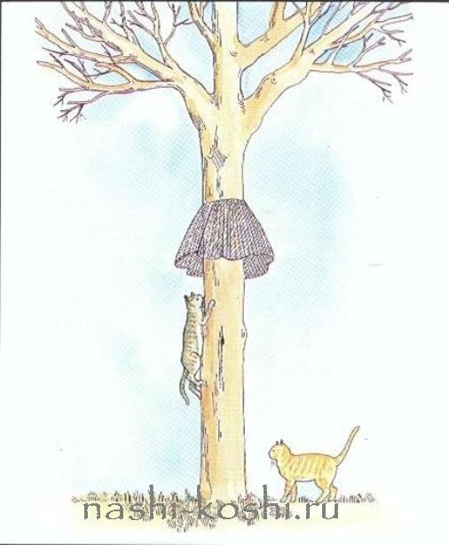 Существует простой способ предотвратить эту ситуацию: на высоте около двух метров прикрепите абажур из тонкой проволочной сетки (конечно, не колючей) — животное не сможет преодолеть это препятствие и забраться выше него, но будет иметь возможность играть на дереве и стачивать когти.