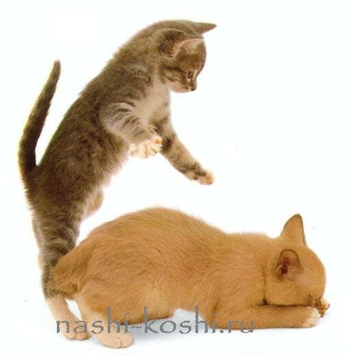 Когда котята гоняются друг за другом, преследователь и преследуемый то и дело меняются ролями: то один из них изображает мышку, а другой охотника, то наоборот. В принципе, они делают то же, что и наши дети, когда играют в казаков-разбойников или в полицейских и бандитов. Как бы ни были возбуждены участники игры, они никогда не нарушают главного правила — сильно не кусаться и не царапаться, — так что травмы случаются крайне редко.