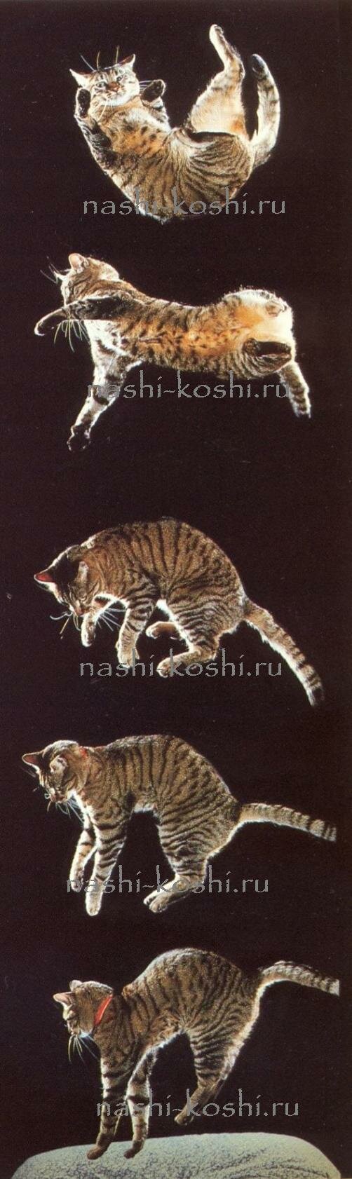Кошка расслабляется, растопыривает лапы и, используя сопротивление воздуха, стабилизирует свое положение, подобно тому, как это делает парашютист во время свободного полета, когда купол парашюта еще не раскрыт. Расслабленное тело значительно легче переносит удар о землю, так что падение с десятого этажа иной раз может оказаться для кошки менее опасным, чем падение с третьего (только пожалуйста, и ни в коем случае не пытайтесь ставить эксперименты над своими любимцами!).