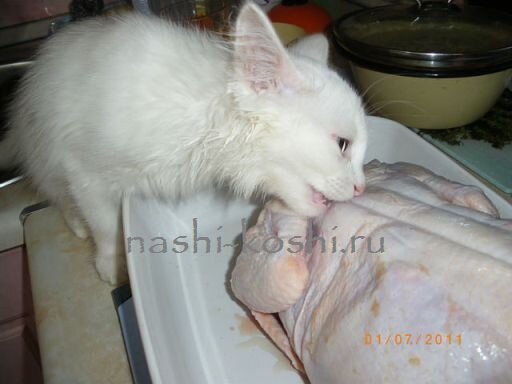 Кошки являются плотоядными животными, поэтому мясо для них – один из самых безопасных человеческих продуктов. Давать ли мясо в сыром, или вареном виде, здесь мнения расходятся. Многие считают, что сырое мясо точно так же опасно для кошек, как и сырая рыба, и яйца. Так же существует мнение, что сырое мясо имеет для кошек гораздо большую энергетическую ценность. В природе кошки съедают добычу вместе с костями, головой, перьями и шкурой. Поэтому домашняя пища тоже должна содержать некоторое количество косточек и хрящей. Разгрызая куриные головы и шеи, кошка заодно очистит зубы от зубного камня.