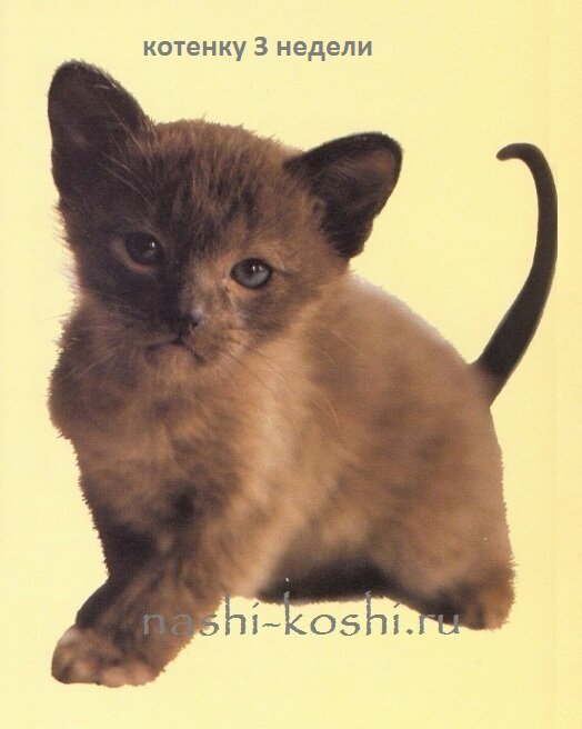 Вес котят достигает уже 290-620 г. и если у вас котенок породистый, пришла пора зарегистрировать его в клубе. Настало время давать малышу раз в день тонко нарезанное свежее мясо, некоторые субпродукты или кошачьи консервы для котят. Твердая пища должна заменить один из четырех приемов молочной пищи. Корм положите в мелкую плошку или в блюдечко в таком количестве, чтобы котенок смог съесть за один раз.