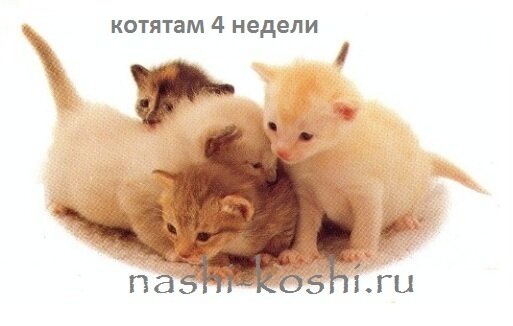 Котенок в этом возрасте весит от 400 до 900 г, и у него прорезались все молочные зубы; малыш совсем перестает сосать мать. Два или три раза в день он должен получать твердую пищу и блюдечко коровьего молока, которое можно заменить свежей водой. Свежее молоко или вода должны находиться в доступном месте; меняйте их по крайней мере дважды в день. По мере развития котят растут и их потребности в материнском молоке.