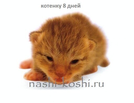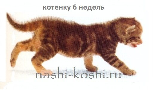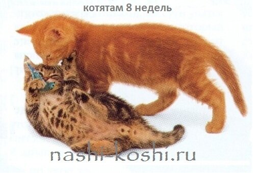 Котенок весит от 315 до 700 г. В возрасте 6-8 недель начинаются охотничьи игры. Вообще-то, котенка можно отдавать новому хозяину и после 6 недель, но лучше, если он останется с матерью до 8-недельного возраста, т.е. до того момента, когда он перестанет сосать. Увеличьте количество твердой измельченной пищи в рационе малыша, заменив еще два приема молока сбалансированным кормом для кошек, или натуральной пищей.
