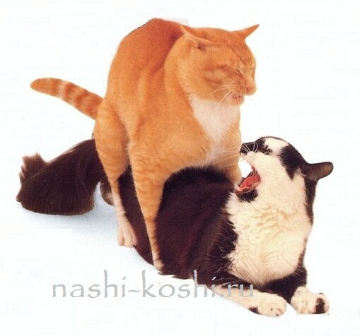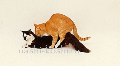 6. Эякуляция (семяизвержение) происходит сразу же ( в течение 15-30 секунд), как только пенис входит во влагалище. В момент эякуляции кошка часто пронзительно кричит, почему – неизвестно. Предположительно из-за того, что у кошачьих самцов пенис покрыт мелкими шипами, что причиняет кошке боль, но стимулирует овуляцию. В то же время, кричат отнюдь не все кошки.